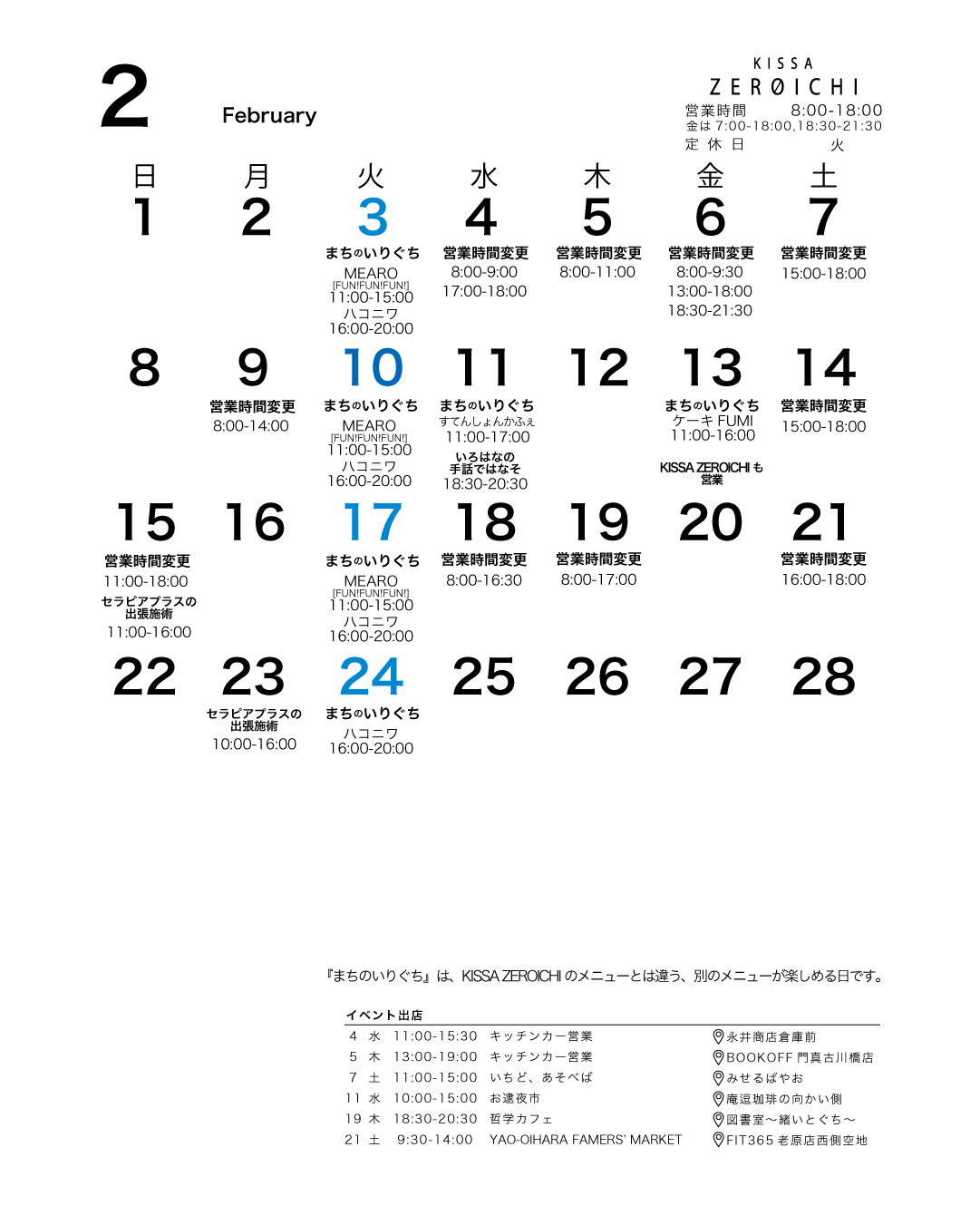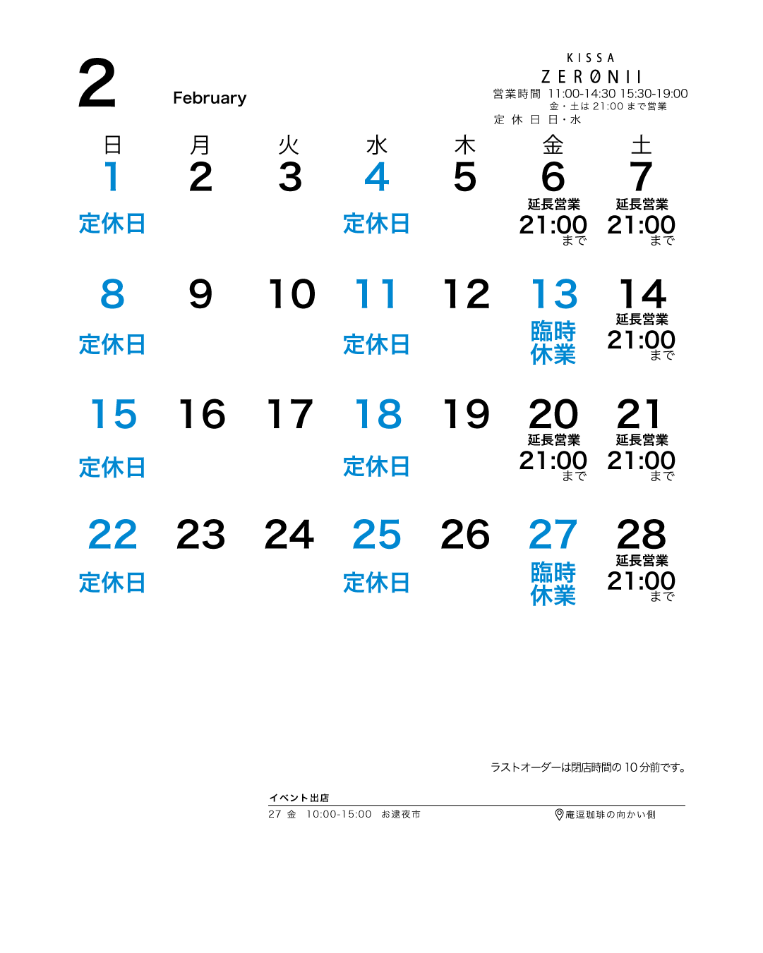 2月 営業日のお知らせ NEWS 2026.01.31 2026年2月の営業日をお知らせします。 目次 KISSA ZEROICHIKISSA ZERONII KISSA ZEROICHI KISSA ZERONII